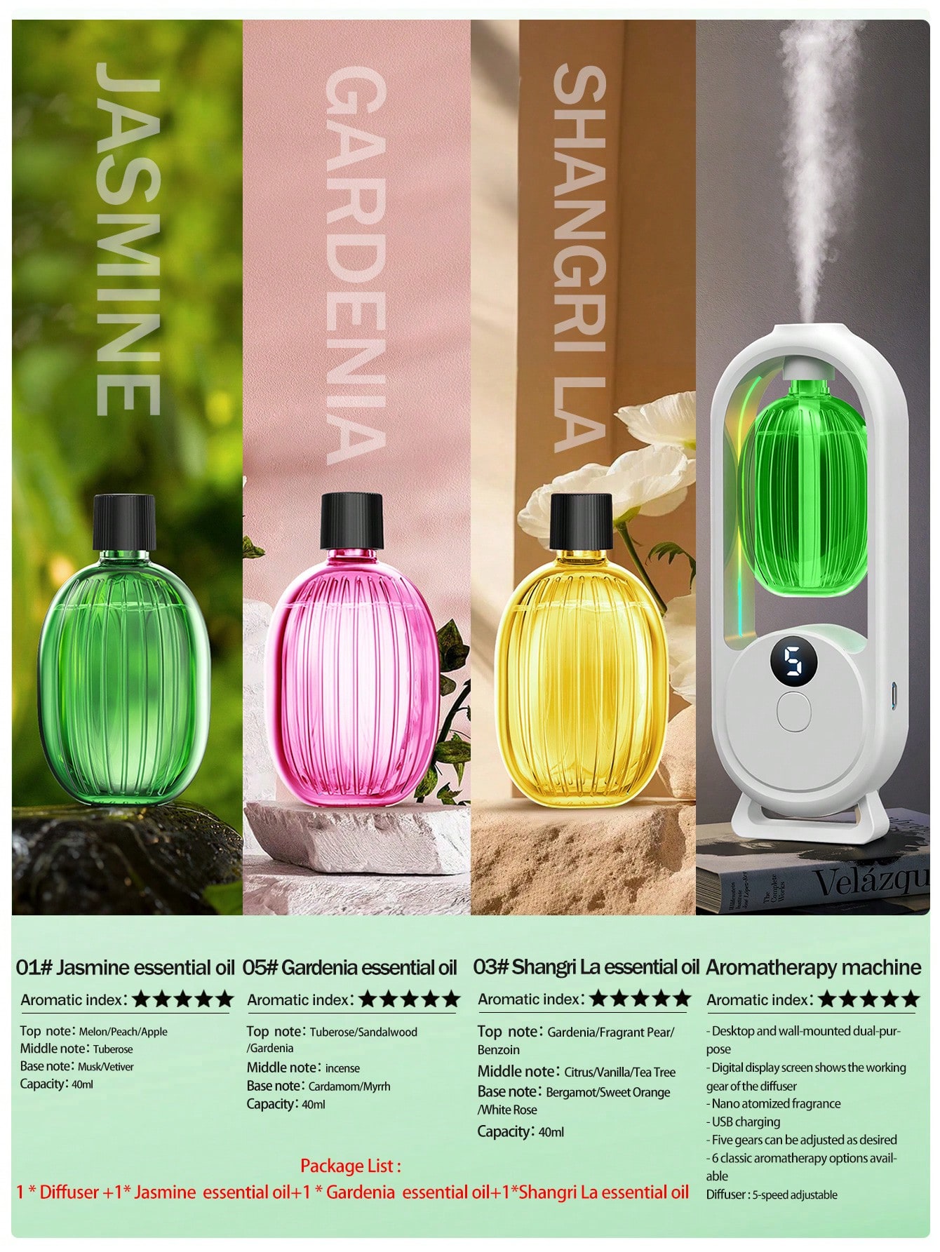 Multiple Essential Oils: Includes 6 kinds of essential oils for variety and aromatherapy benefits.
