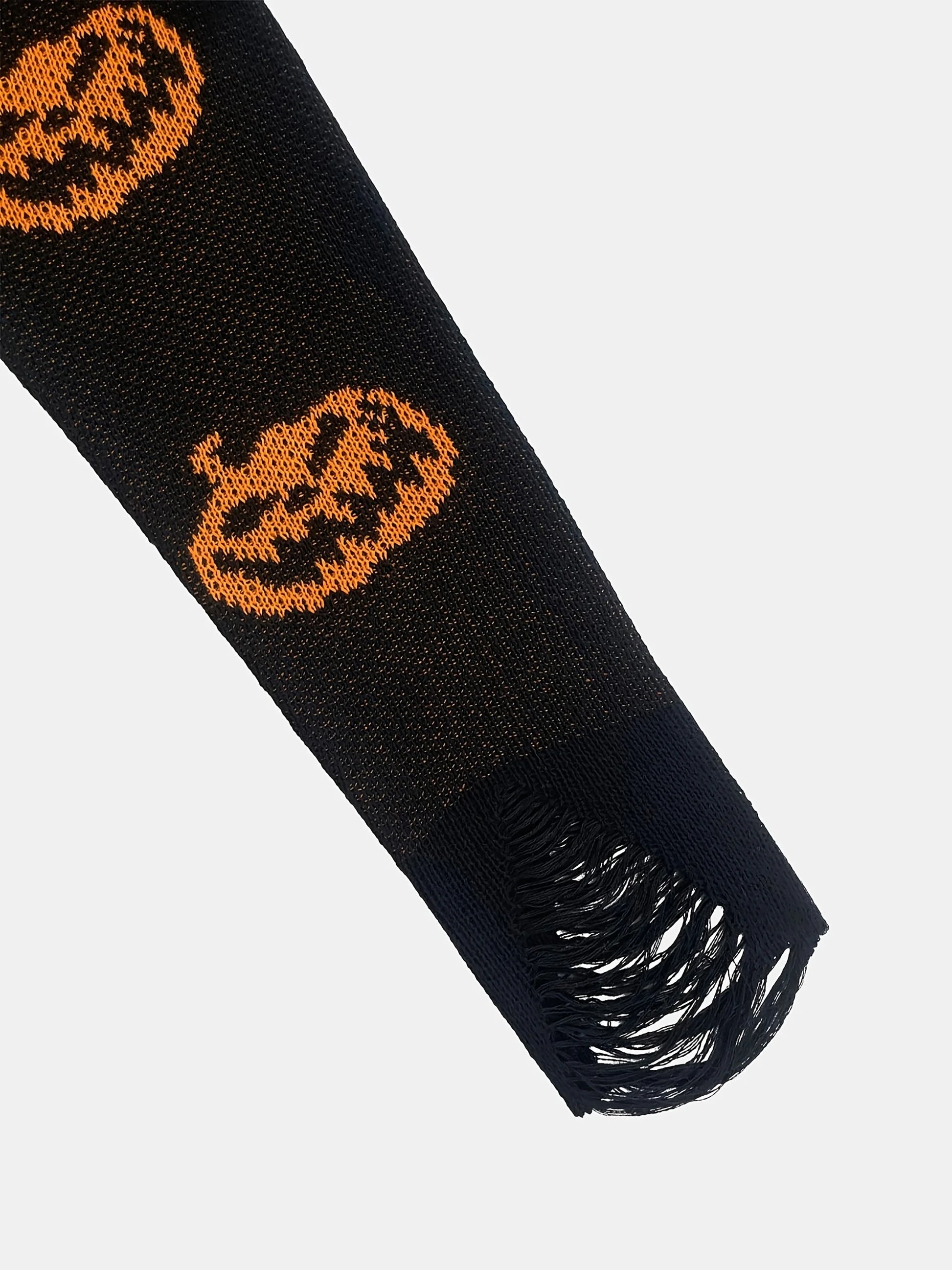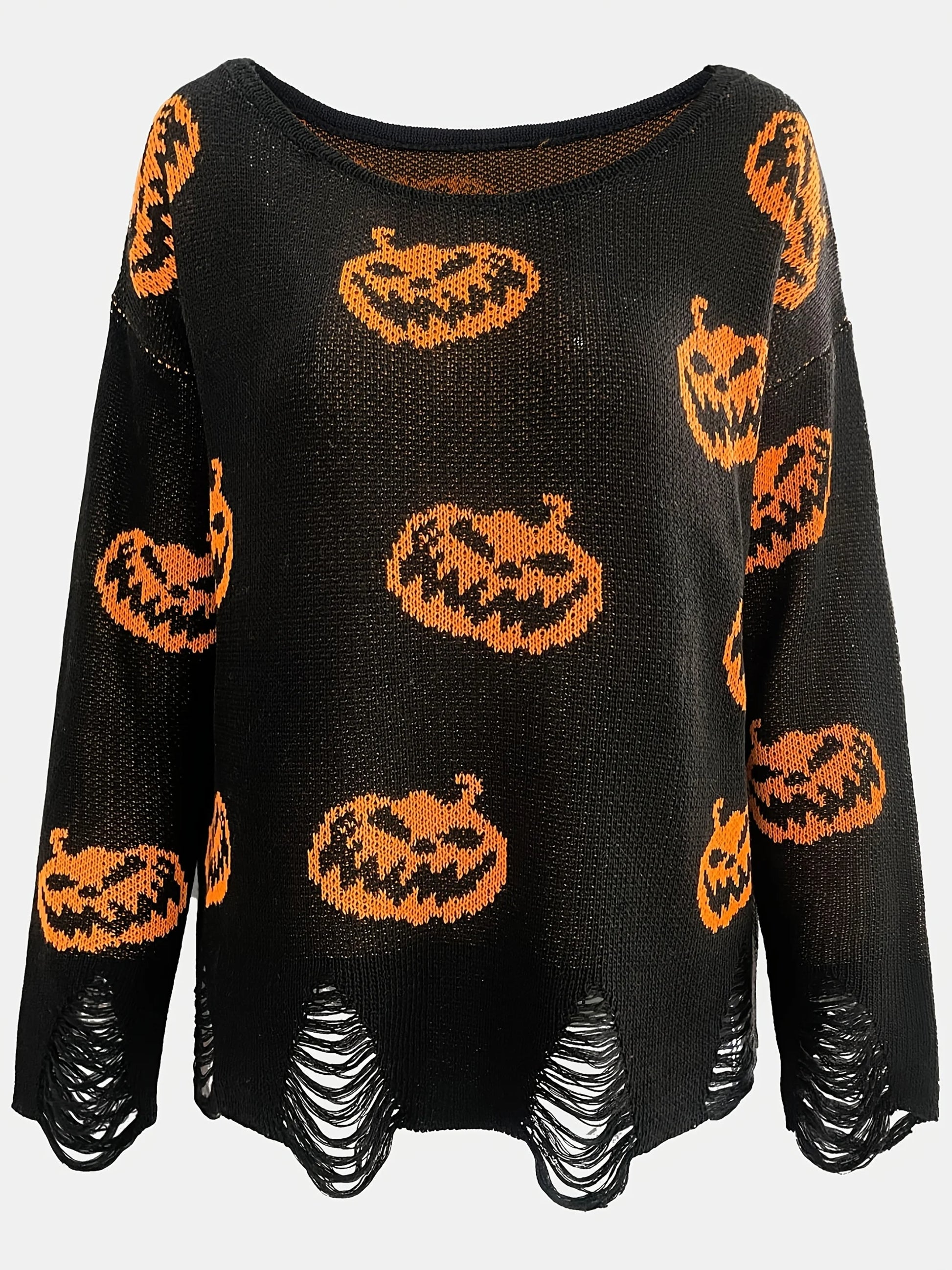 Women’s Autumn Winter Halloween Sweater – Round Neck Loose Woolen Pullover with Distressed Hole Design, Cozy Casual Knit Top